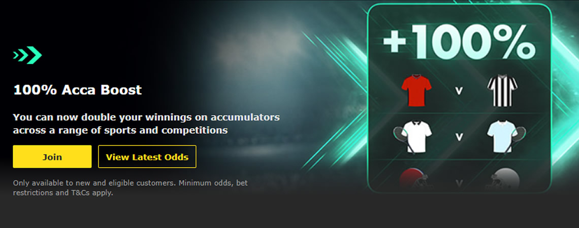 - This boost applies to winnings on accumulators of 2 or more selections on the standard Full Time Result (Soccer only), Both Teams To Score (Soccer only), Result/Both Teams to Score (Soccer only), Spread (Basketball, American Football only), Run Line (Baseball only), Puck Line (Ice Hockey only), Money Line 2-Way & 3-Way (Basketball, American Football, Baseball, Ice Hockey only), Game Totals (Basketball, American Football, Baseball, Ice Hockey only), 1st Half Spread (Basketball, American Football), 1st Half Totals (Basketball, American Football), 2nd Half Spread (NFL & NBA only), 2nd Half Totals (NFL & NBA only), A Run in the 1st Innings (Baseball only), To Win Fight (MMA only), Fight Outcome (MMA only), To Win Match (Tennis only), First Set Winner (Tennis only) and Set Betting markets (Tennis only) for selected leagues and competitions, listed below.